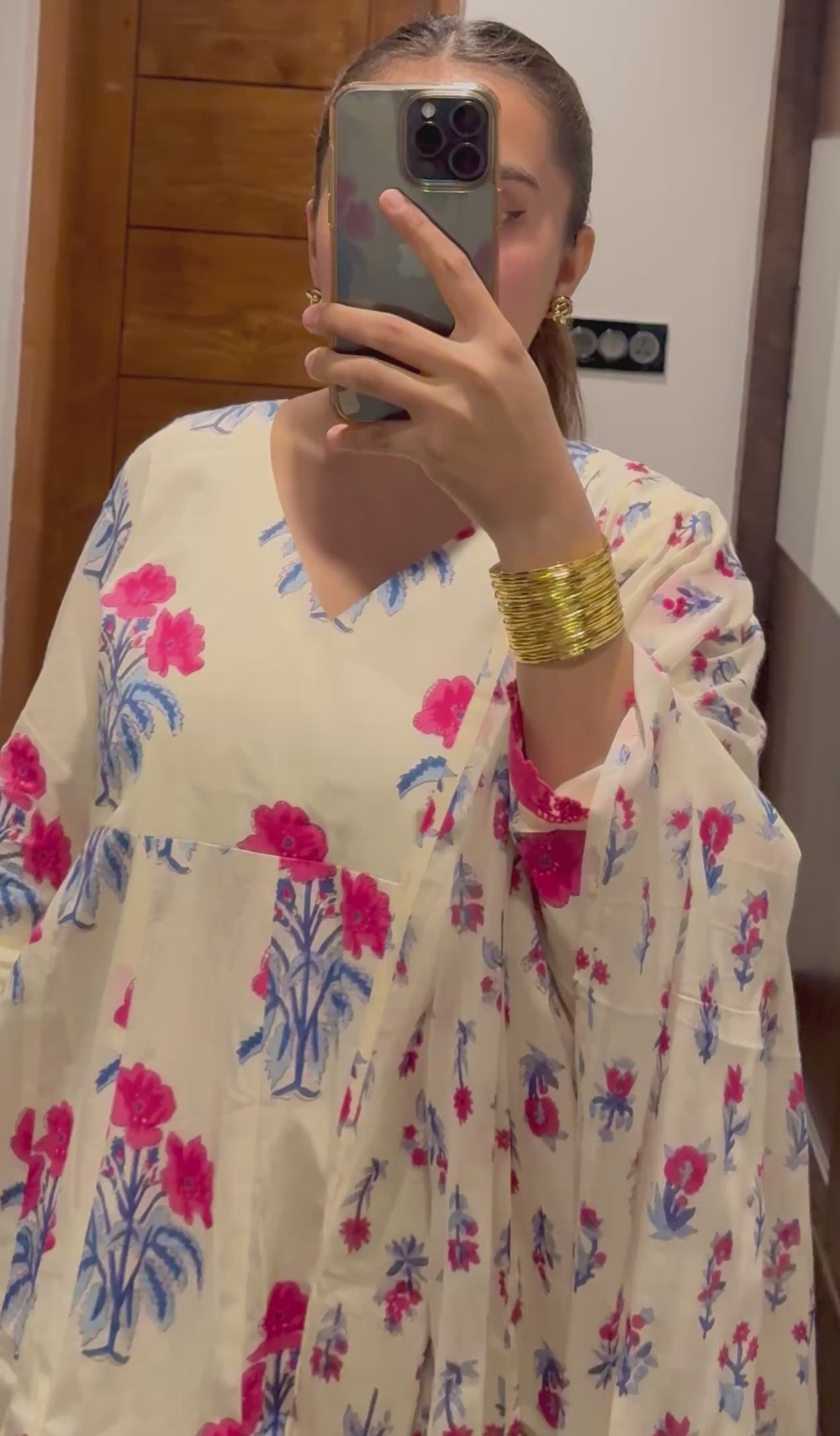 A beautiful 3-piece panel-cut Anarkali set in a white, featuring a long, flowing Kurta,  trousers, and a dupatta. The set is covered in a distinctive Mughal-style block print of large floral motifs in vibrant pink/magenta and deep blue.