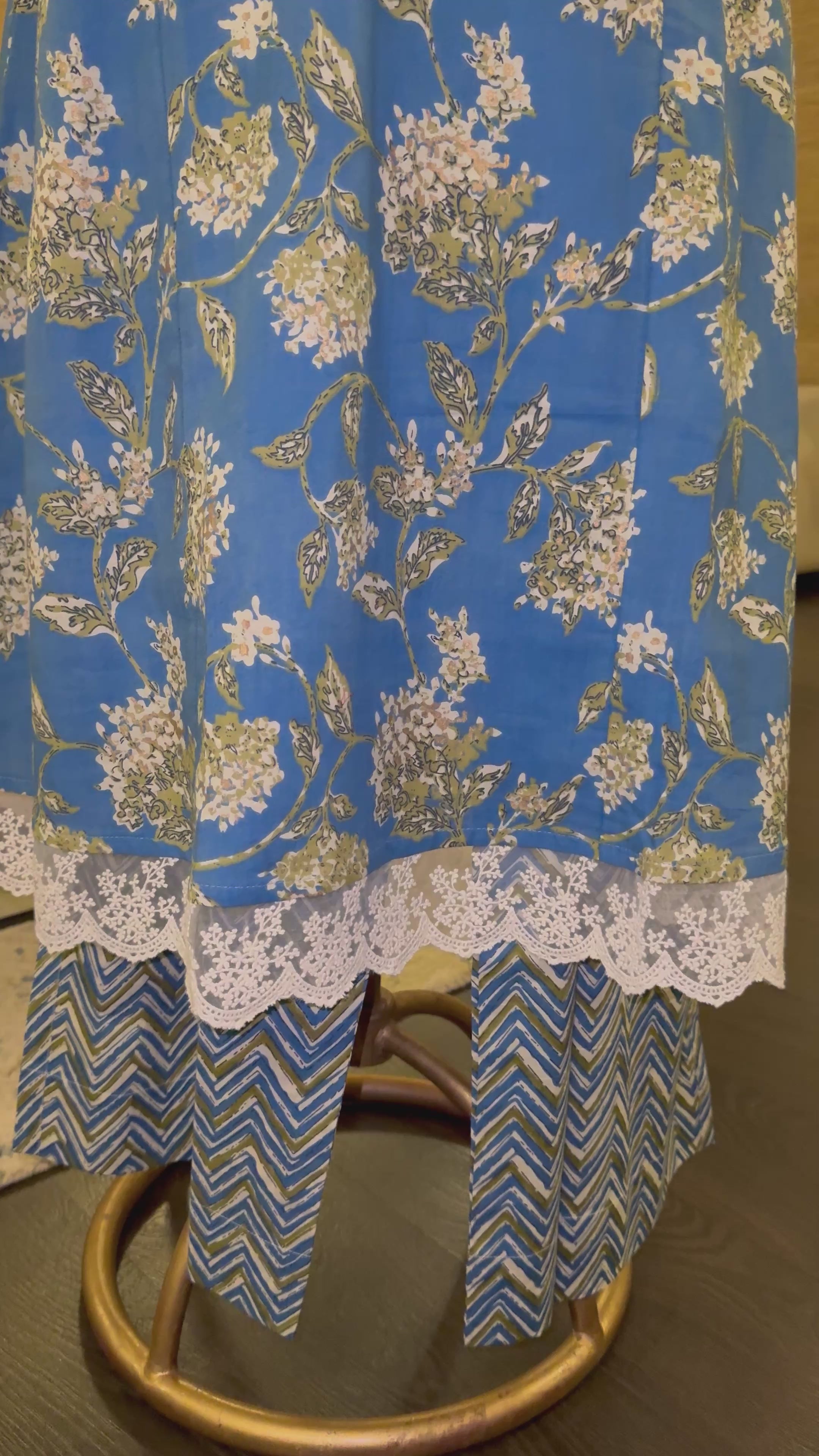 Crafted in soft cotton , A refreshing blue floral kurta adorned with delicate lace detailing, paired with chevron printed pants for an effortlessly elegant look.